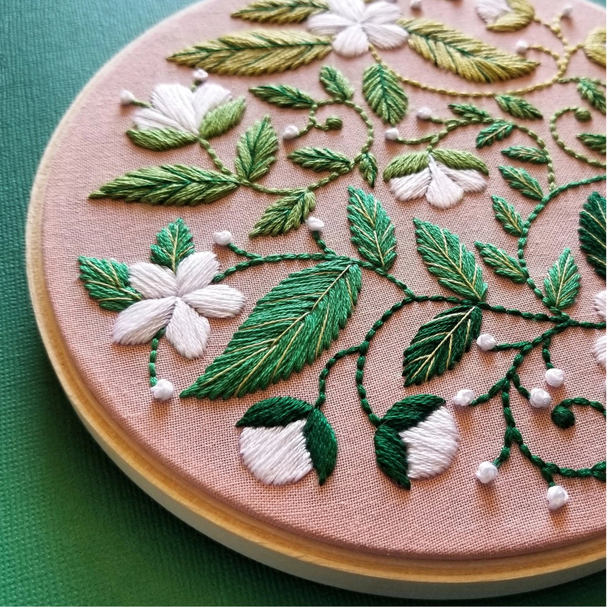 The embroidery kit includes: * Light pink cotton fabric, printed with the design in color. These guidelines are permanent. * One 5 inch hand embroidery hoop * Hand embroidery needles * 5 skeins of DMC cotton hand embroidery floss. * The color printed embroidery pattern * A copy of the Beginner Guide